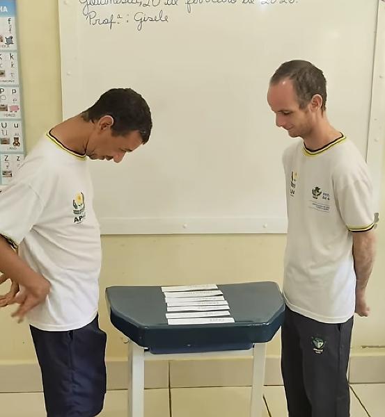 No vídeo, dois alunos são posicionados de lados contrários de uma mesa, que possui palavras espalhadas. Então, a professora fala em voz alta a palavra que eles precisam identificar, pegar e mostrar.